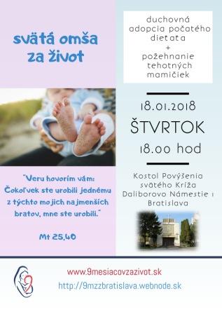 Sme radi, že môžeme šíriť službu duchovnej adopcie počatého dieťaťa vo svätých omšiach Za Život. Tentokrát nám otvoril dvere svojej farnosti Kostola Povýšenia svätého Kríža v Petržalke, na Daliborovom nám. 1, otec Milan Bubák, za čo mu veľká vďaka. Sv. omša sa bola vo štvrtok, 18. januára 2018 o 18:00 a celebroval ju kaplán Milan Grossmann.